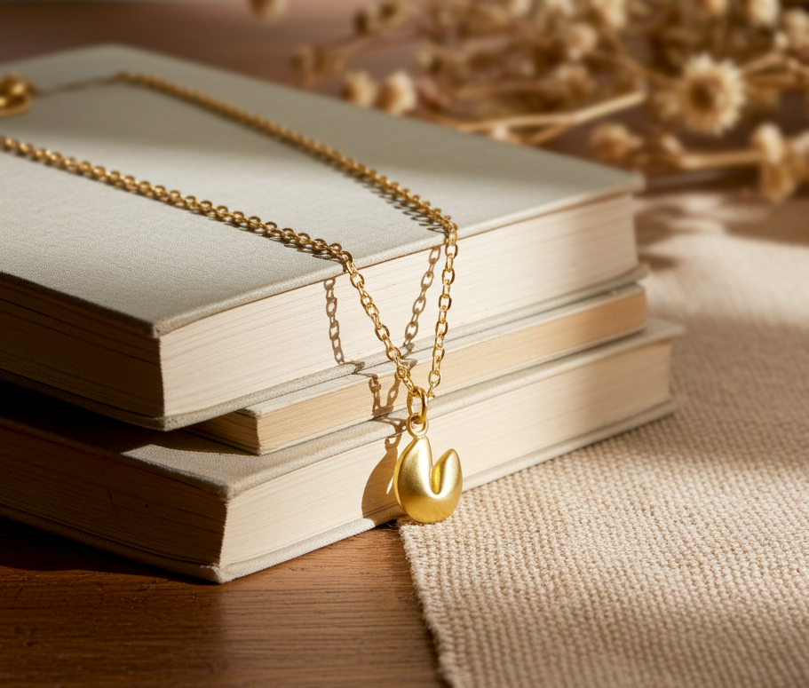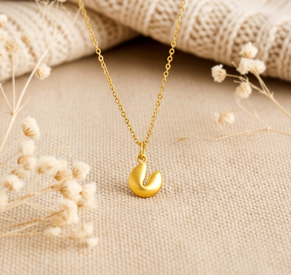 Kleiner goldfarbener Glückskeks an einer feinen Kette.