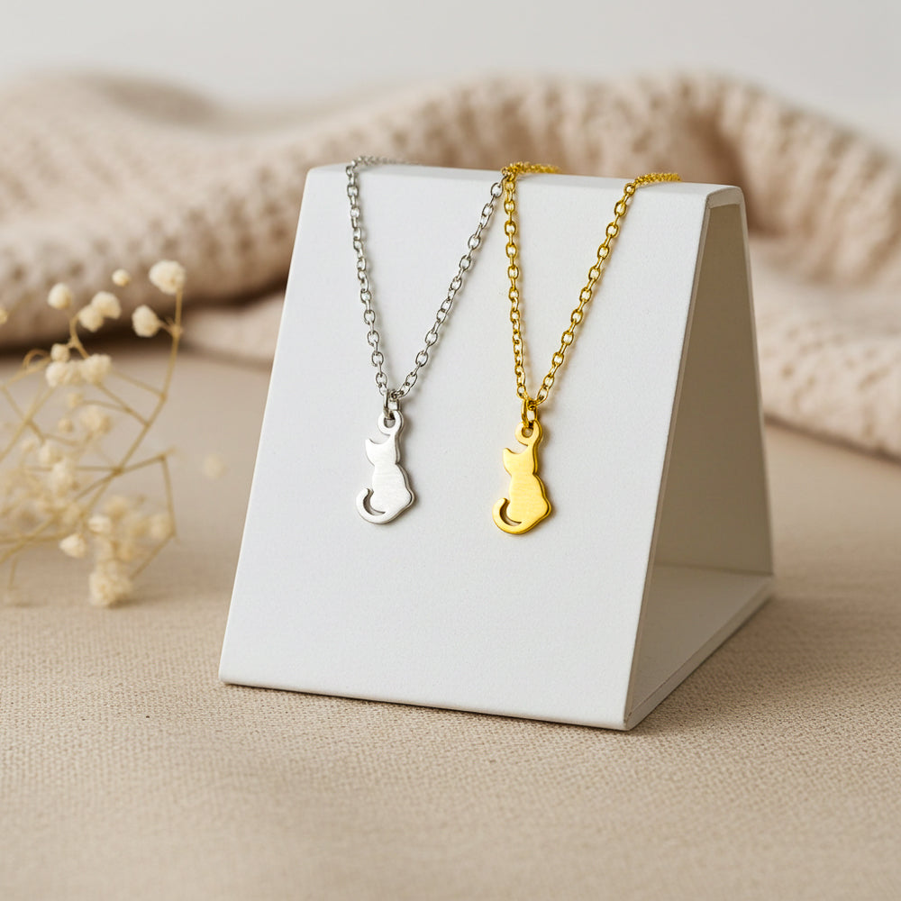 Feine Edelstahl Kette mit einem Katzenanhänger.