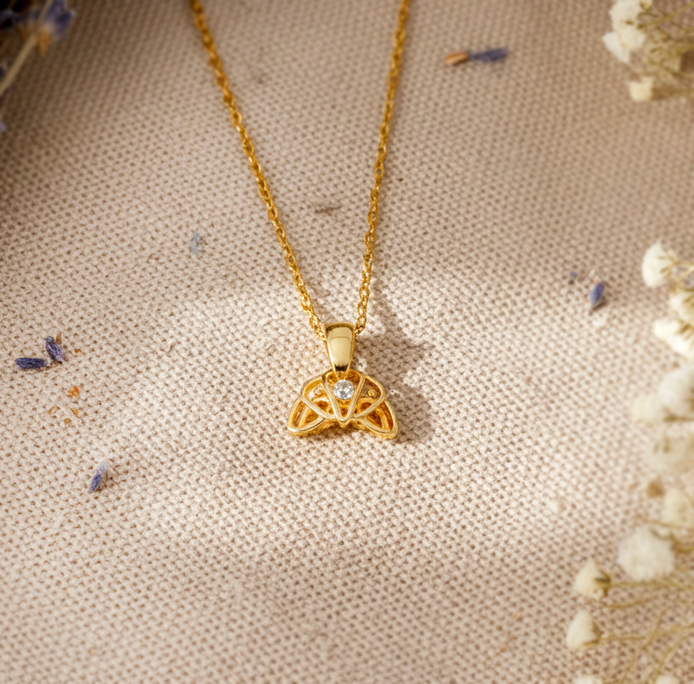 Eine Kette mit einem Croissant-Anhänger mit Zirkonia-Steinen.