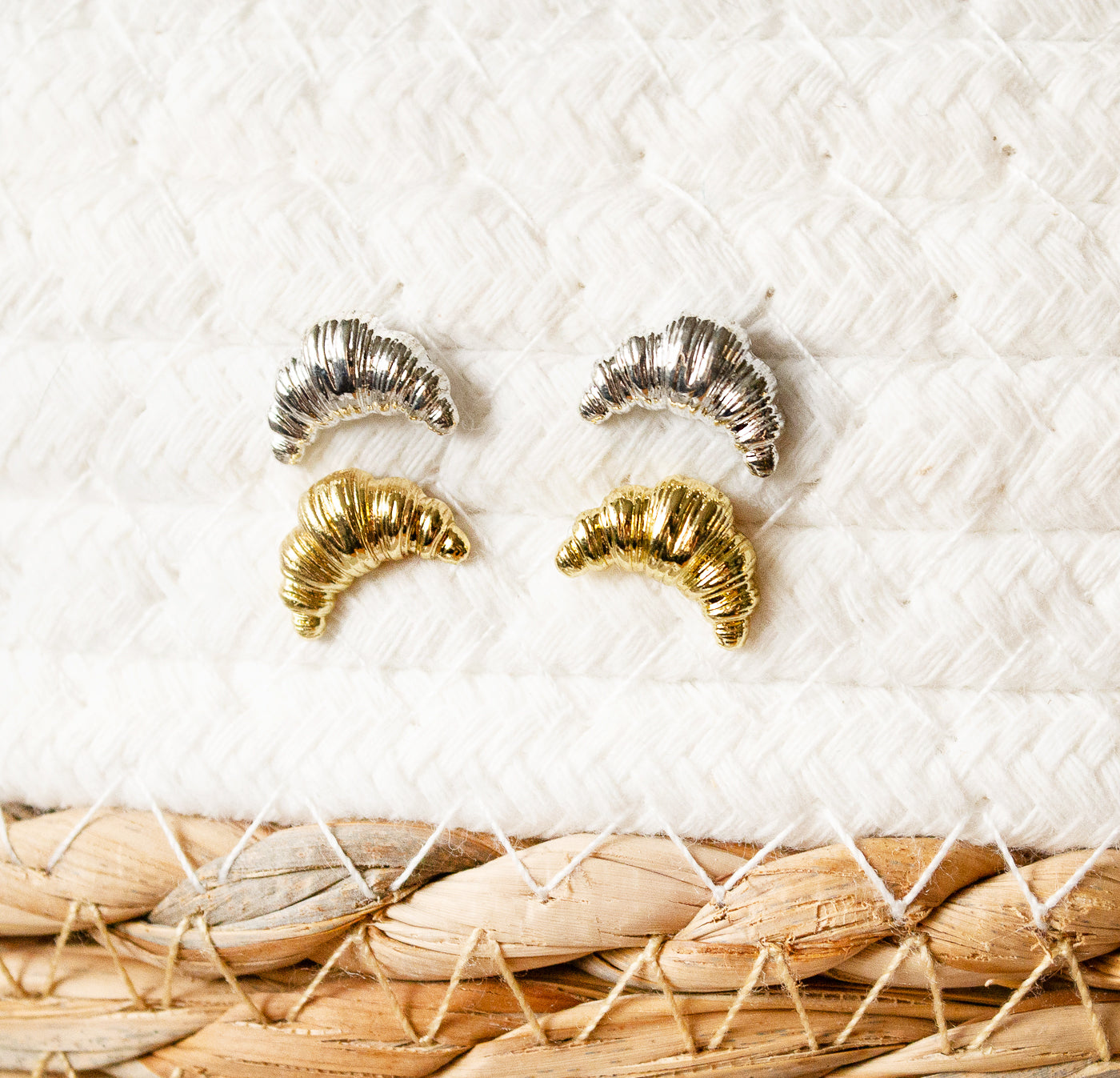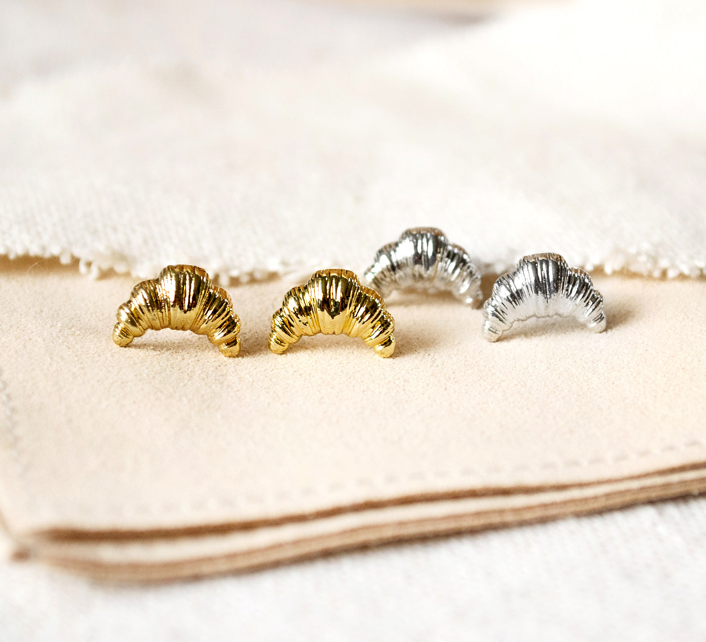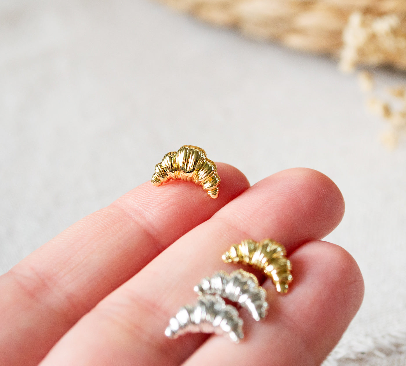 Diese zarten Croissant-Ohrstecker sind das perfekte Accessoire für alle, die das süße Leben lieben. Ob goldfarben oder silberfarben – sie bringen einen charmanten, verspielten Akzent in jeden Look.